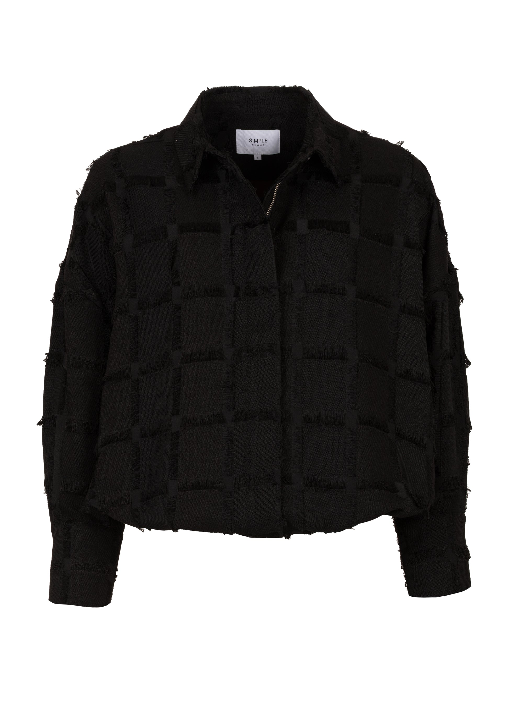 This statement jacket combines a modern design with a playful texture. The unique square pattern with frayed edges gives the piece a contemporary and distinctive look. Made from 100% polyester, the fabric feels lightweight and comfortable, making it perfect for both casual and dressy occasions. The design features a classic collar, long sleeves, and a straight fit that is easy to style for different looks.